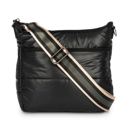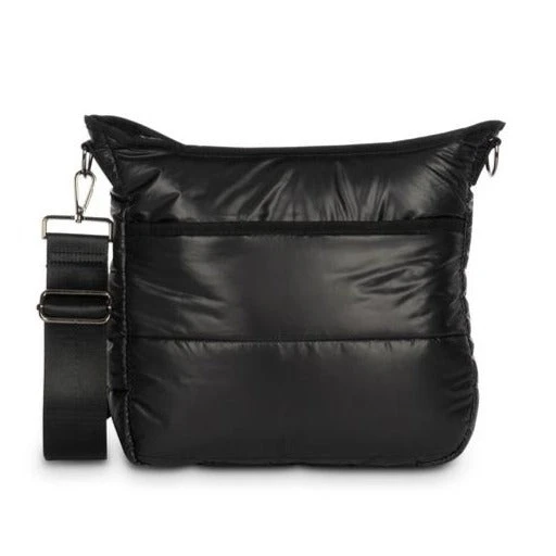 Black matte puffer with top zip, hidden front pocket zipper, interior zip pocket and slotsÂ