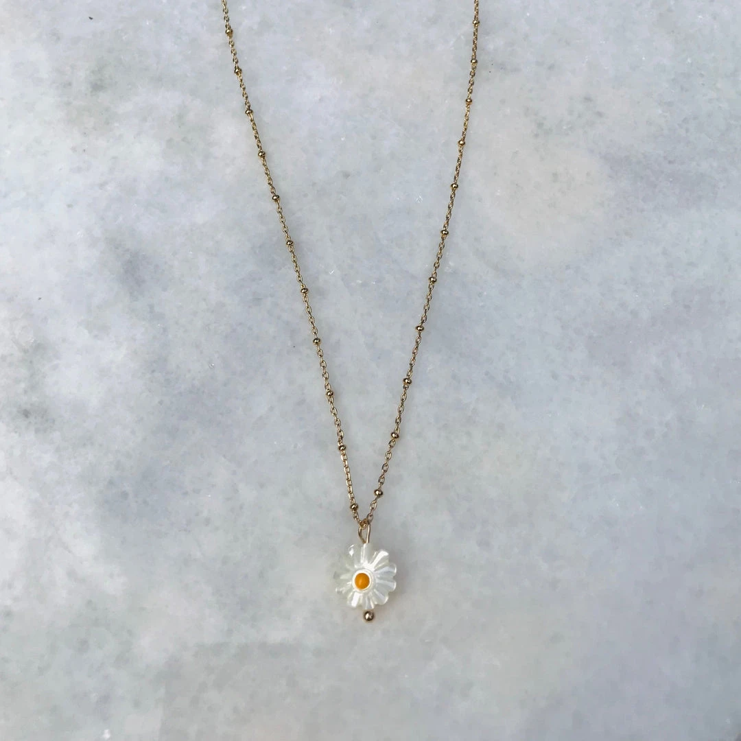 - Gold chain with white daisy pendant