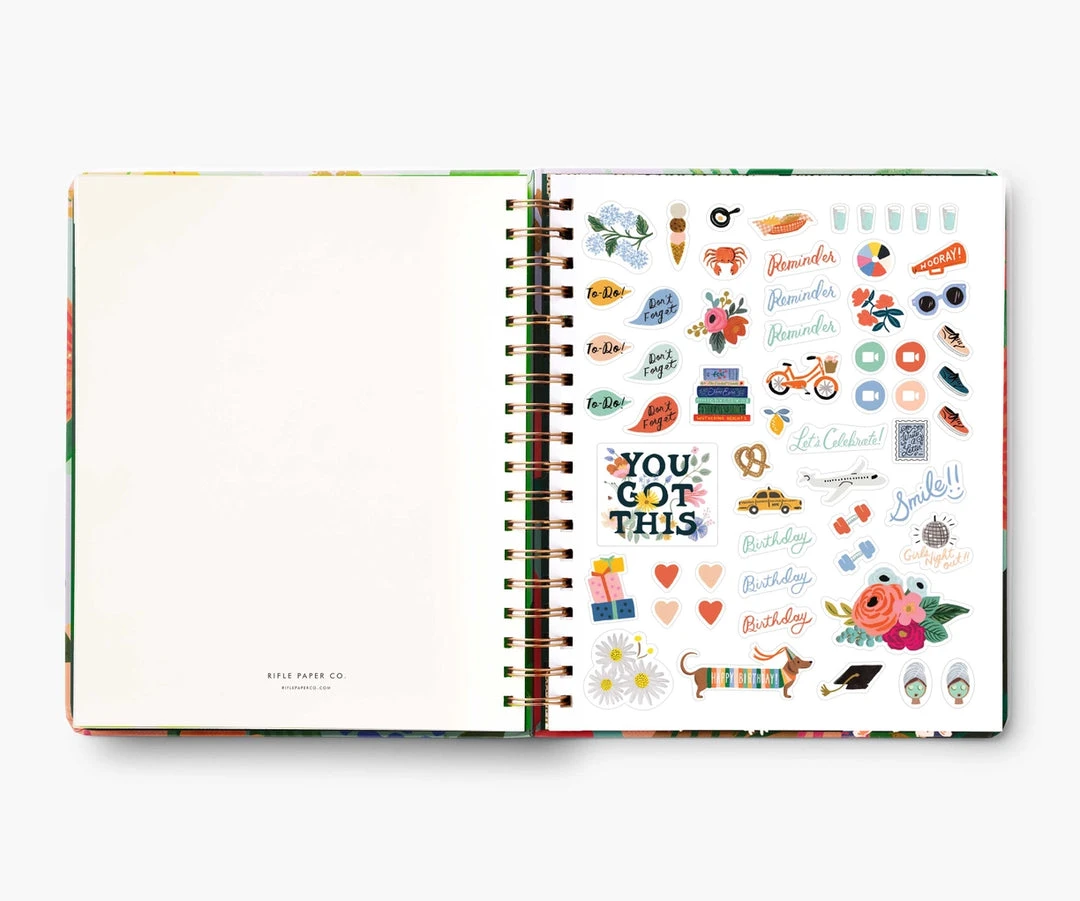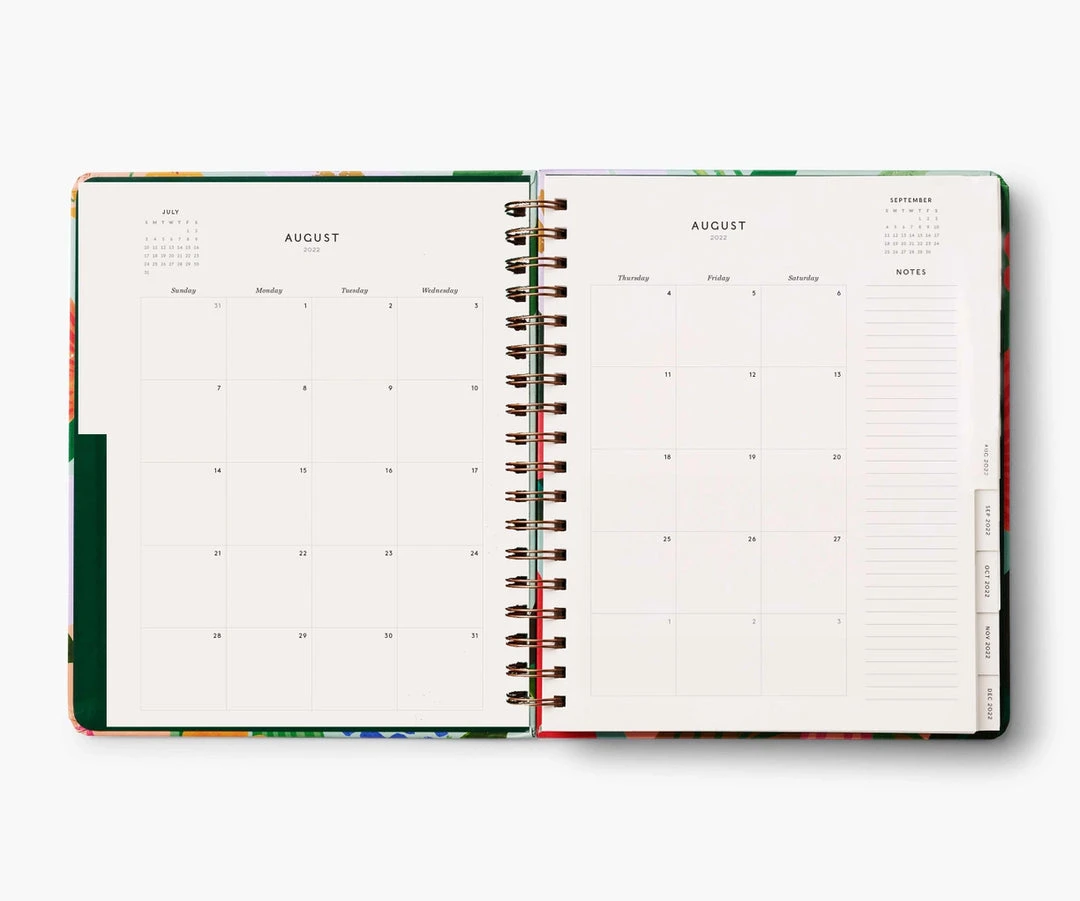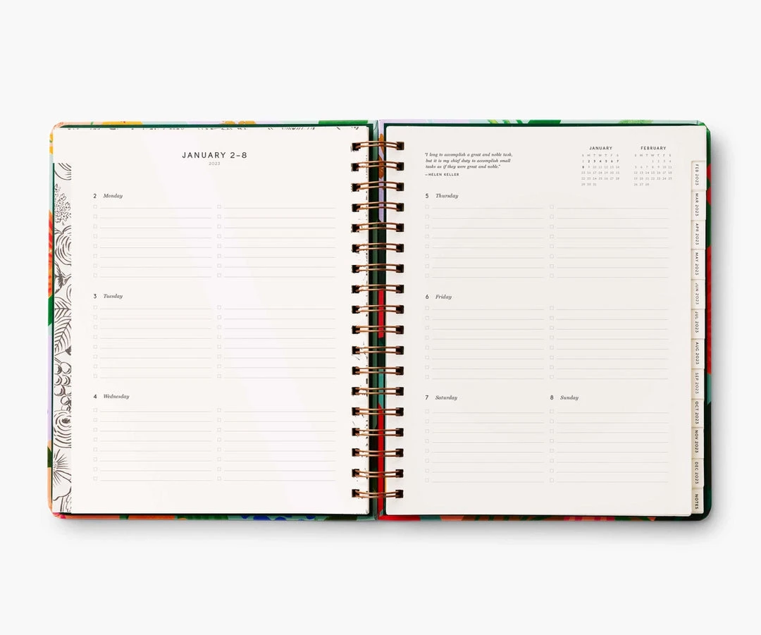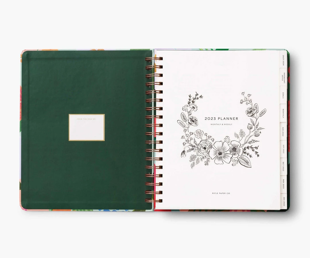 Start planning ahead with our 2023 17-month planners. A sturdy hard cover wraps over the interior spiral binding, and an elastic band holds the pages closed. Inside you’ll find monthly and weekly views, inspirational quotes, sections for celebrations, notes and contacts, pocket folders for storage, and three sticker sheets for extra fun. Planners span August 2022-December 2023.