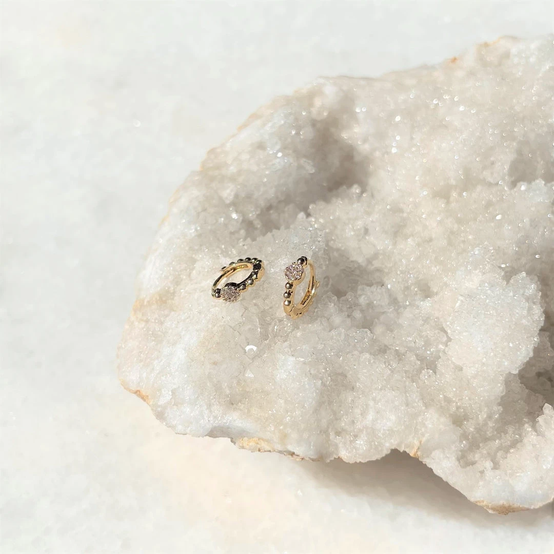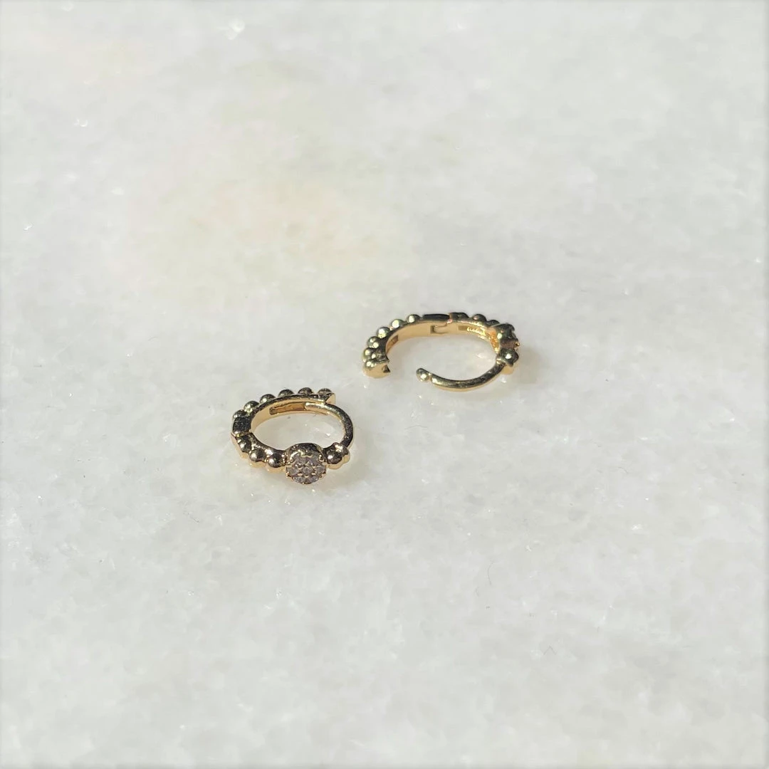 - Dainty gold huggie earrings with dotted texture and small CZ pave detail