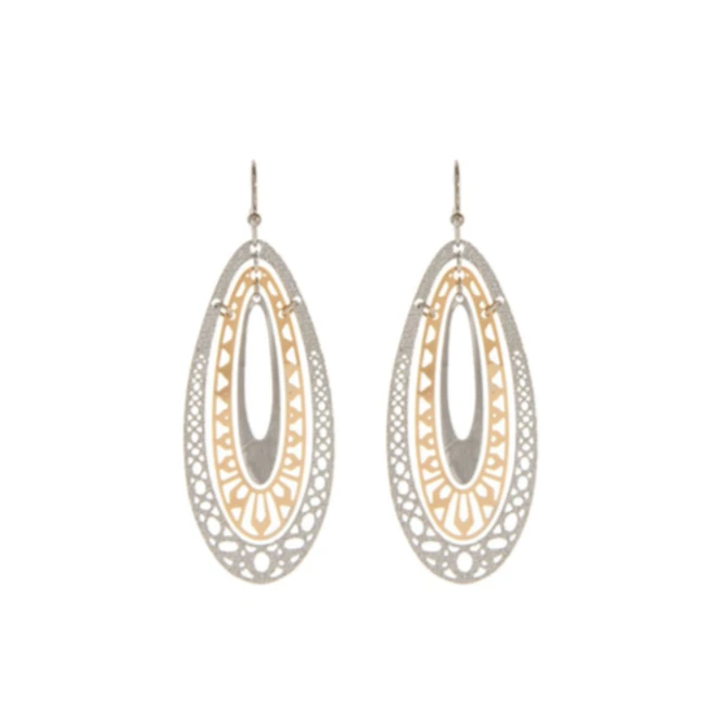 Silver and Gold Two Tone Triple Inset Mixed Filigree Ovals Lightweight Earring