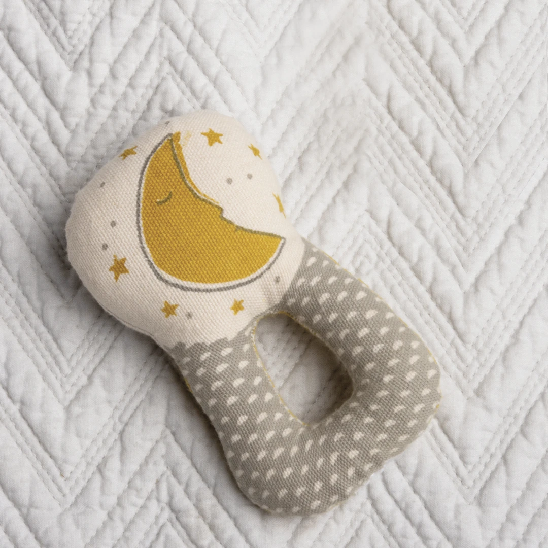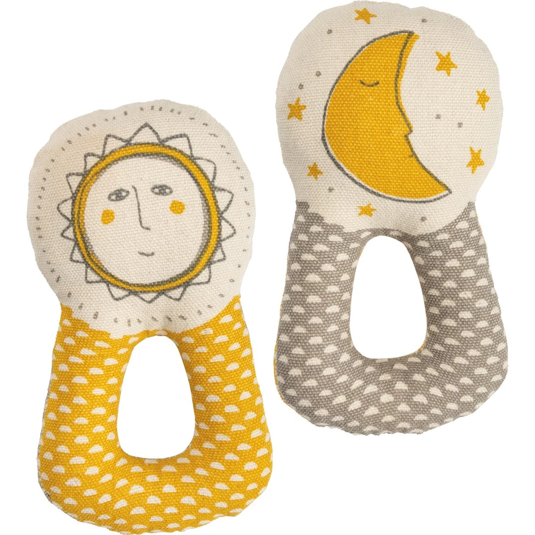 A double-sided cotton rattle in a smiling sun and sleeping moon design with center cut-out for an easy grip. Textiles are phthalate and AZO dye free.