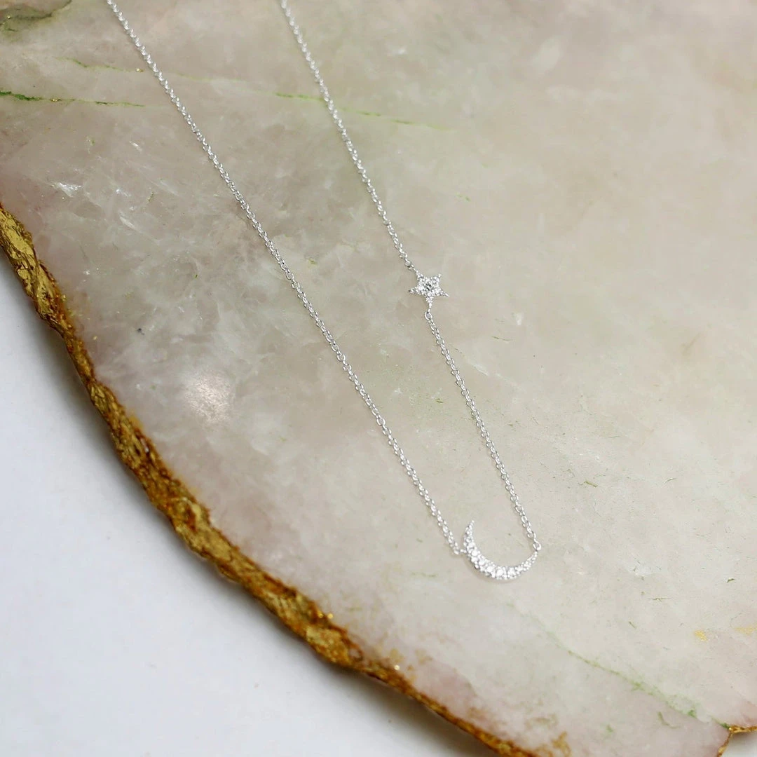 – Sterling silver and Cubic Zirconia necklace with tiny crescent moon and star charms.