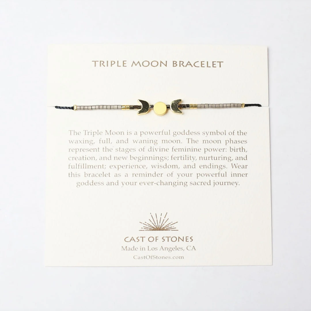 The Triple Moon is a powerful goddess symbol of the waxing, full and waning moon. The moon phases represent the stages of divine feminine power: birth, creation and new beginnings: fertility, nurturing and fulfillment; experience, wisdom and endings. Wear this bracelet as a reminder of your powerful inner goddess and your ever-changing sacred journey.