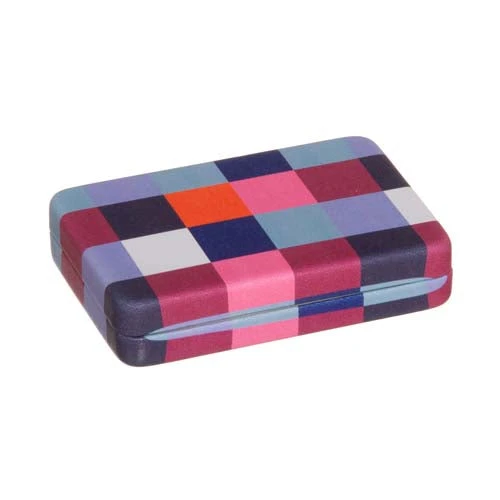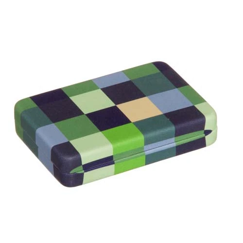 – Spring hinged case with colorful plaid faux leather exterior opens to reveal a compartmentalized interior with a mirror inside the lid.
