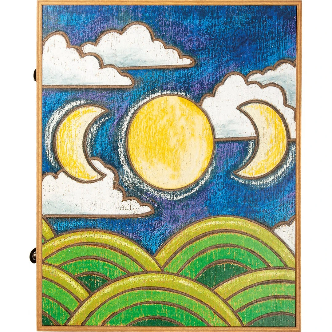 A wooden travel Backgammon game featuring intricate, vibrantly colored wood burned designs. Includes 34 game pieces that can be stored inside the latched game board. Also includes an instruction sheet.