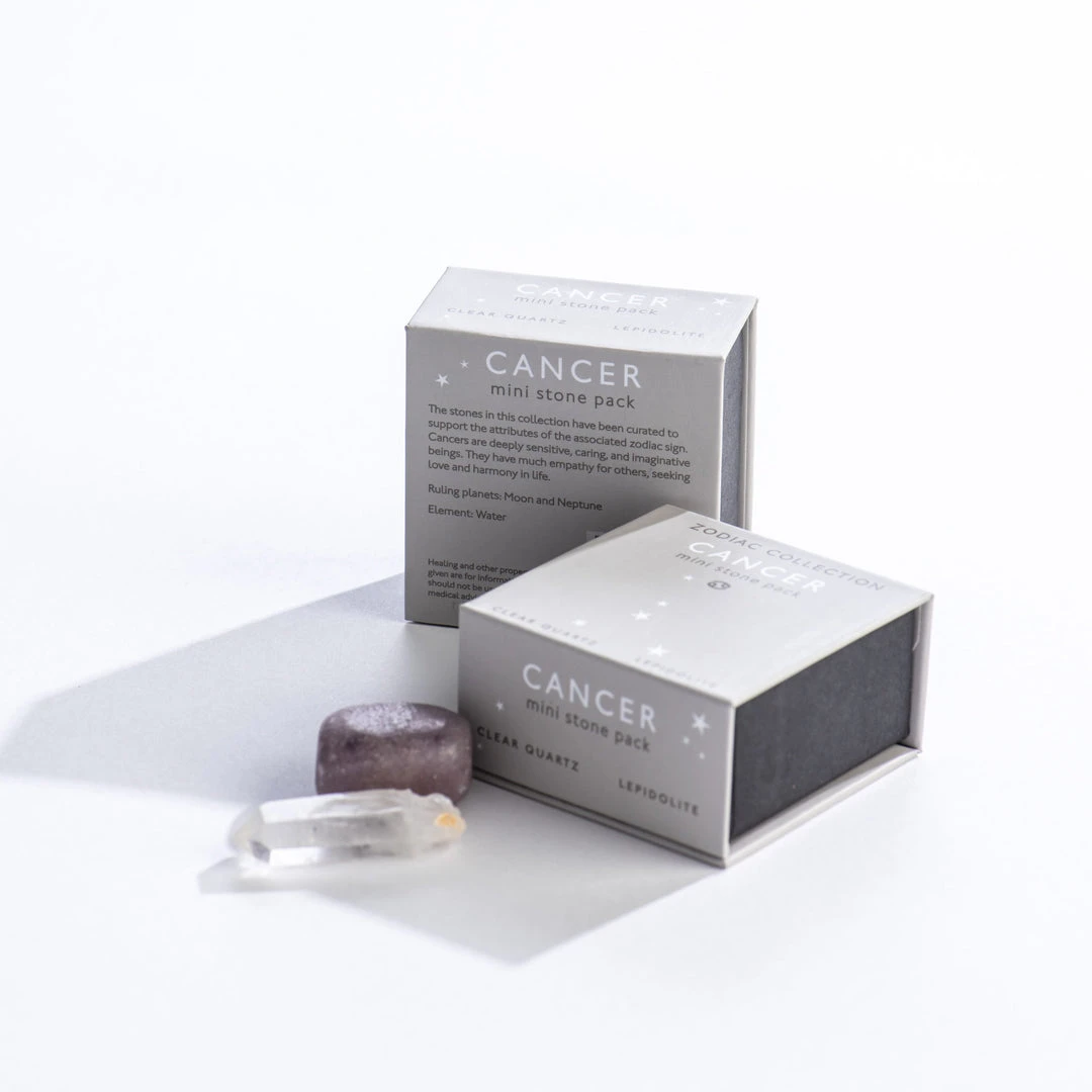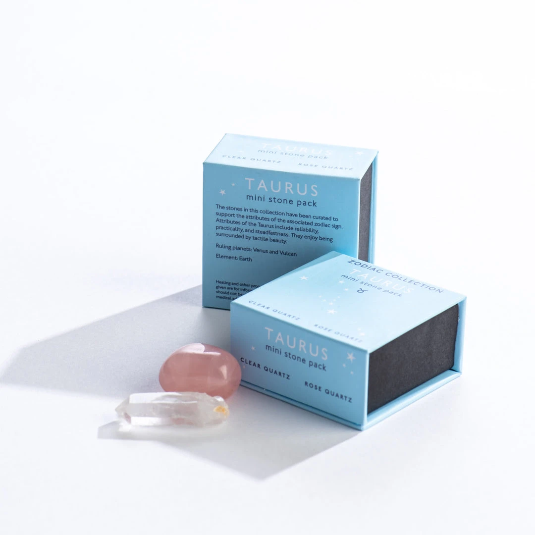 Zodiac Collection: 12 zodiac signs paired with corresponding crystals and colors. Inner box cover describes crystal properties and back cover describes zodiac sign attributes.